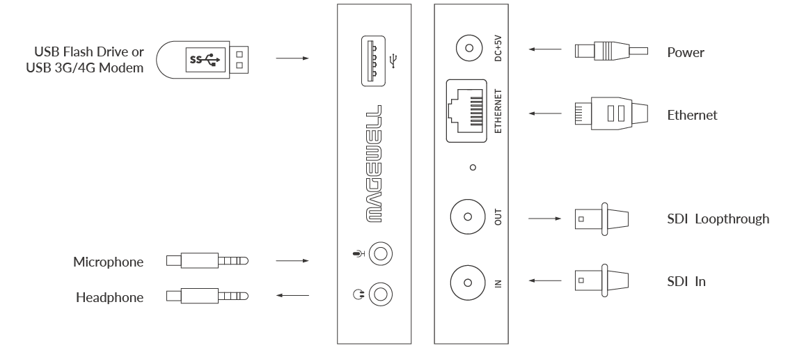 - Nahrávať and streamovať 1 kanál 3G SDI + vstavané audio + mikrofónny signál